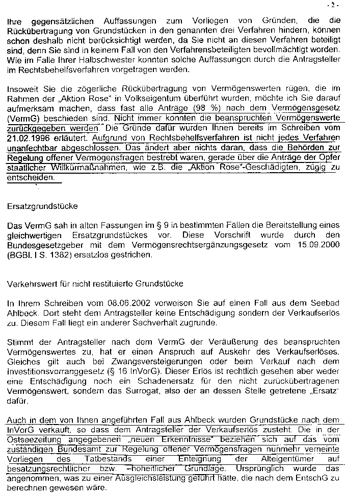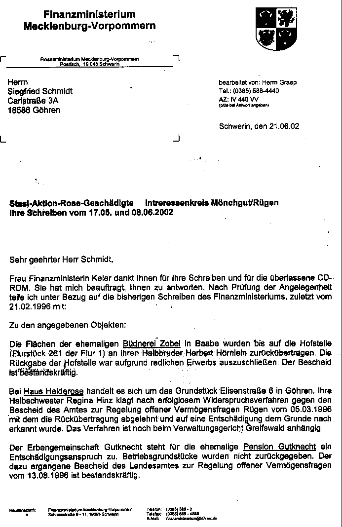 Die Staatsmafia ließ keine Gelegenheit aus, die politisch verfolgten Christen der Aktion Rose, die zurückgekehrt waren, mit allen Mitteln zu schikanieren, um ihnen zu verdeutlichen, daß es besser wäre, das in Generationen erworbene Eigentum billig abzustoßen und das Land zu verlassen. Aus unserem Interessenkreis erhielten nun 3 Familien ihr Eigentum nicht zurück: