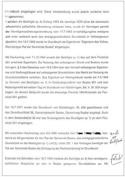 Diese Falschdarstellung des Landgerichtes Stralsund habe ich einmal mit meiner Beschreibung der Vorsprache von Herbert beim Bürgermeister von Baabe im April 1990 nachgewiesen, an die sich der Bürgermeister -jetzt- nach erfolgter bisher ersatzloser Enteignung von Mutti erinnern will .