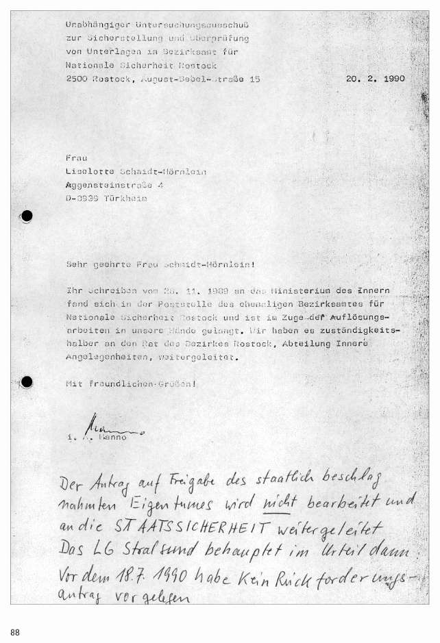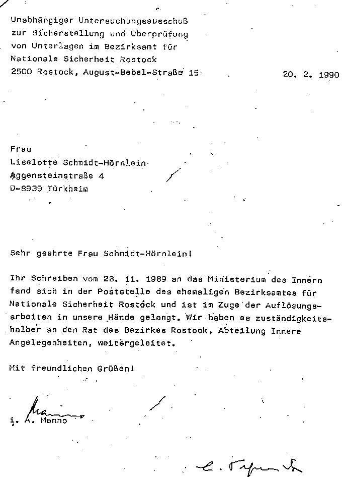 -Und die Veröffentlichung eines Anschreibens der Unabhängigen Kommission zur Auflösung des Amtes für Nationale Sicherheit -Stasi-Nachfolger in Rostock, die ihrerseits das Ur-Anschreiben von Mutti im Posteingang der Staatssicherheit/Amt für Nationale Sicherheit in Rostock gefunden hatte im Februar 1990.