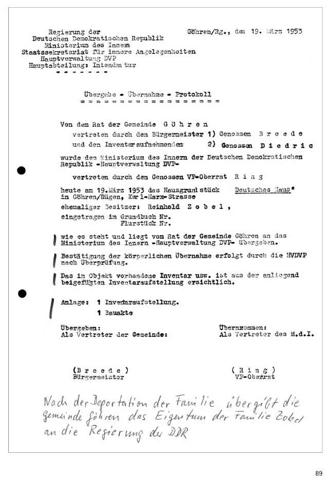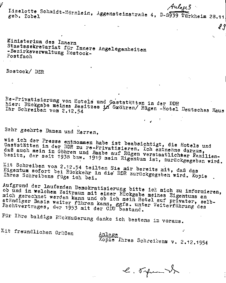 -Ferner ein Schreiben des MdI, das im Frühjahr 1990 schriftlich an Mutti bestätigte, dass solange sich auf dem Hotelgrundstück in Göhren ein Ferienheim der Volkspolizei befinde, hier keine andere Nutzung erfolgen könne. Solange es nicht andere Gesetze gäbe.