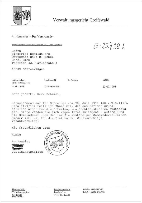 Außerdem nimmt Herr Schmidt Bezug auf die Rückforderung des Zobelhofes, wie er es hier nennt. Hier wird behauptet, das Landgericht Stralsund habe ausgeführt, dass vor dem 18.7.1990 kein Antrag auf Rückforderung gestellt sei.