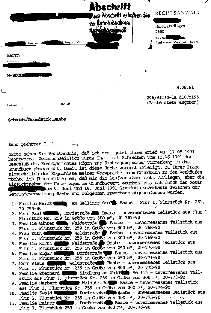 (mein Schriftverkehr mit H. D. von 1996 mit dem Amt Baabe liegt in meinem Archiv. Damals wollte die Gemeinde Baabe/Amt Mönchgut nach den Ausführungen von H. D. mein Grundstück enteignen und ein Parkhaus errichten. Schriftlich bot ich daraufhin der Gemeinde das Grundstück zum Kauf an, jedoch mit der ausschließenden Bedingung, dass zunächst der Zobelhof am Selliner See als Eigentum zurückübertragen werden müsse. Hier könne man dann auch bezüglich des Grundstückskaufpreises eine Erbpachtregelung treffen.)