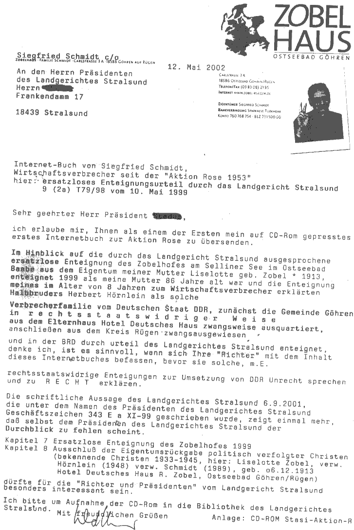 Im Wesentlichen ginge es um die weitere Beschlagnahme des Aktion Rose Eigentumes der Familien Zobel. Er selbst habe bei Familie Zobel, im ehem. Strandhotel als Vertriebener gewohnt, von 1946 bis 1948. Hier handle es sich aber um eine andere Familie Zobel, einen Bruder vom Großvater des Herrn Schmidt oder so.....