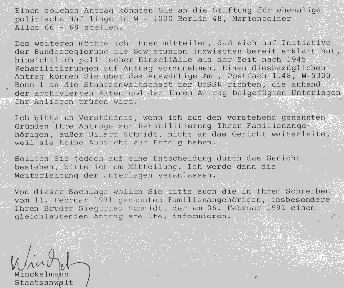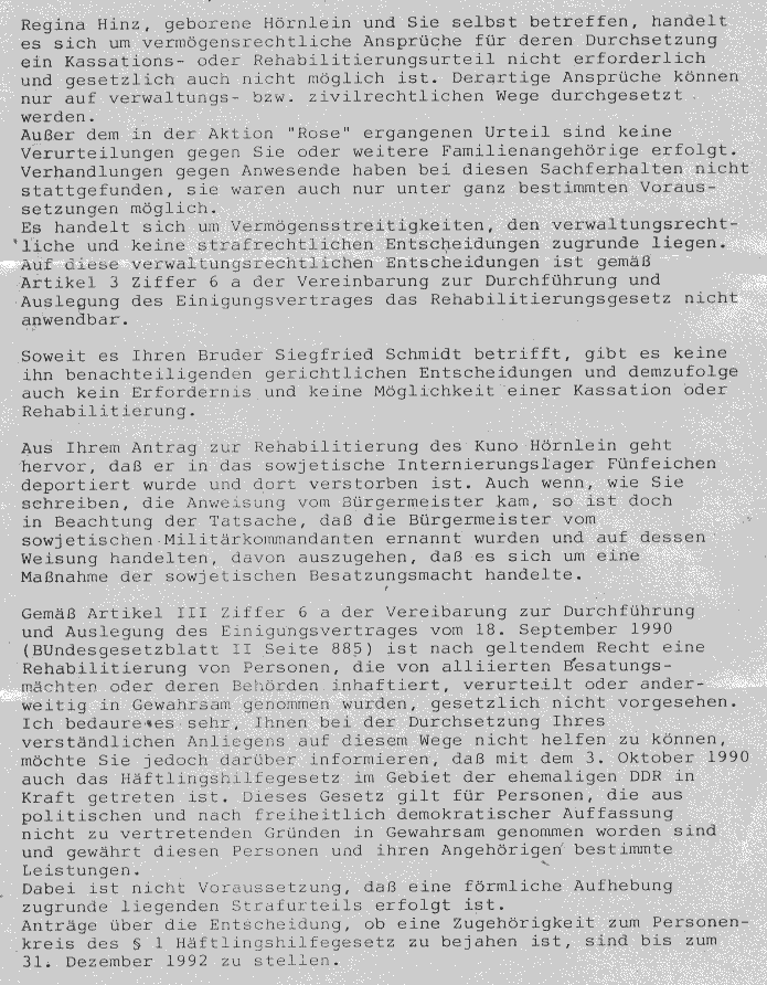 Laut beiliegendem Schreiben der Staatsanwaltschaft Schwerin vom 29. Juli 1991, Staatsanwalt Winckelmann, ist eine Enteignung meiner Mutter bis zur Deutschen Einheit - und auch bis zur Verfassung des Briefes des Staatsanwaltes