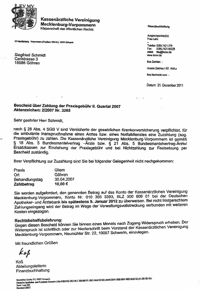 .. In Ihrer Klinik befindet sich zur Zeit Frau Liselotte Schmidt, Carlstraße 3, 18586 Göhren. Frau Schmidt wurde nach den mir vorliegenden Informationen und nach ihren eigenen heutigen Bekundungen am Telefon gegen ihren Willen durch Herrn Dr. X, Göhren eingewiesen. Soweit Herr Dr. X behauptet, es habe eine Zustimmung von Frau Schmidt vorgelegen, ist dies unrichtig und auch keine Rechtfertigung für ein einwöchiges Festhalten in Ihrer Klinik, denn der freie Wille ist auch beim Aufenthalt in Ihrer Klinik zu berücksichtigen….Die Aussage des Arztes X aus Göhren bezüglich der Freiwilligkeit ist völlig unglaubwürdig, denn er wies gleichzeitig sowohl Frau Schmidt als auch ihren Sohn, Herrn Siegfried Schmidt, der offensichtlich betrunken war, zusammen ein. Für eine solche Doppeleinweisung, die beide Betroffenen aus ihren familiären Verhältnissen riss, konnte unter Berücksichtigung der Lebenserfahrung keine Einwilligung vorliegen.